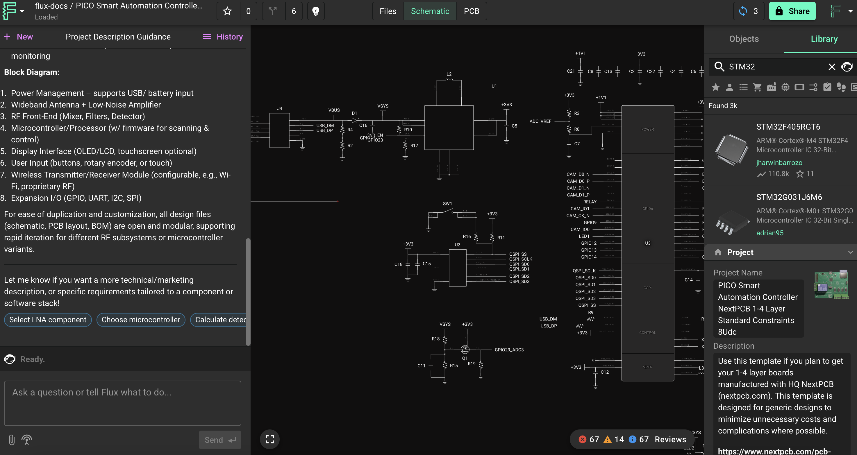 Flux Editor has a built-in hardware design AI assistant. It's a Flux-trained large language model (LLM) that lives inside your project and can provide direct feedback to help you design faster, safer, and more complex PCBs. Learn more about Flux in this tutorial.