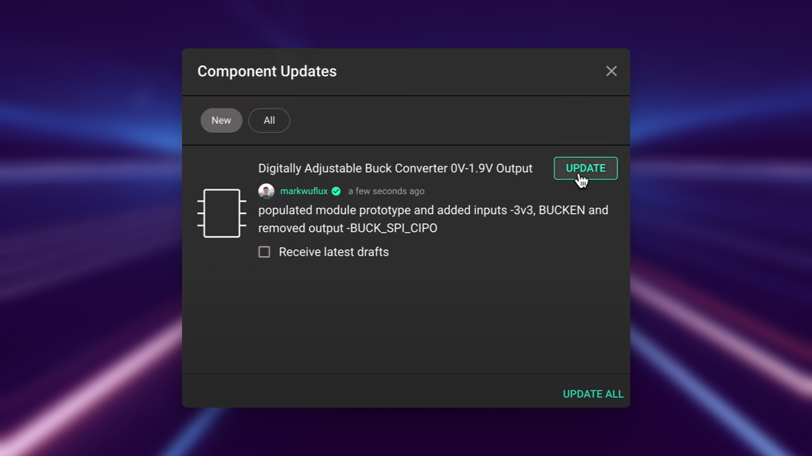 After returning to the parent project, click on the pop-up menu to update your component across projects, found in the bottom left of the screen.