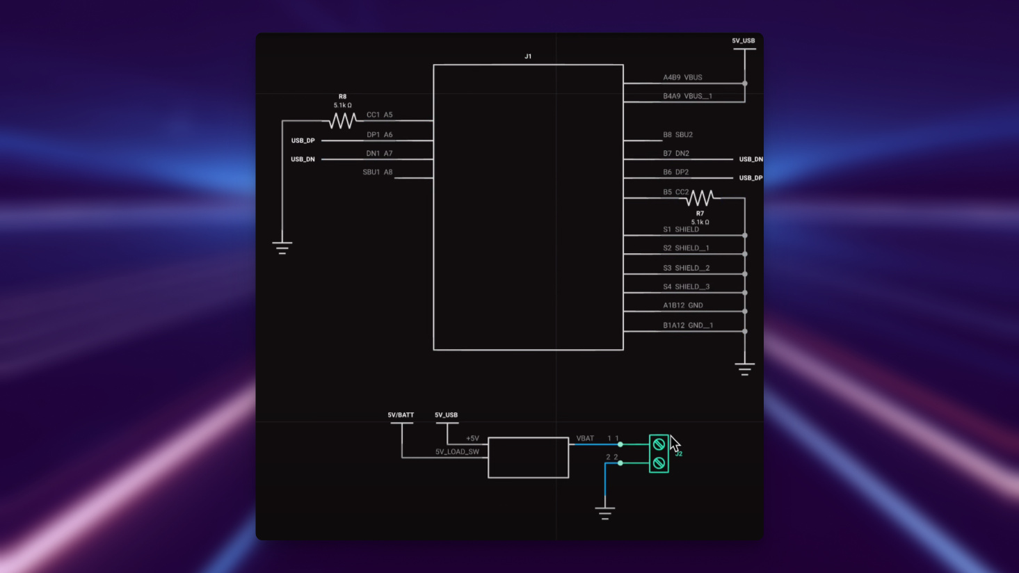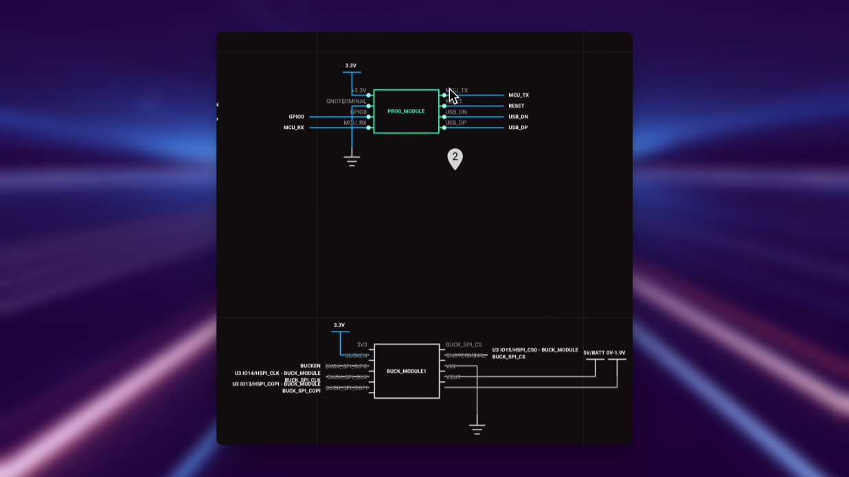 Net Portals (and power portals, there's no difference other than the visual symbol) are an alternate way to form electrical connections between terminals. Terminals connected to net portal labels of the same designators will be in the same net container in the PCB view. Here we've added power portals, such that all 5V-selected items will be connected to the PCB. Same goes for GND, 3.3V, and 0V~1.9V, and any other net portals we may want to add.
