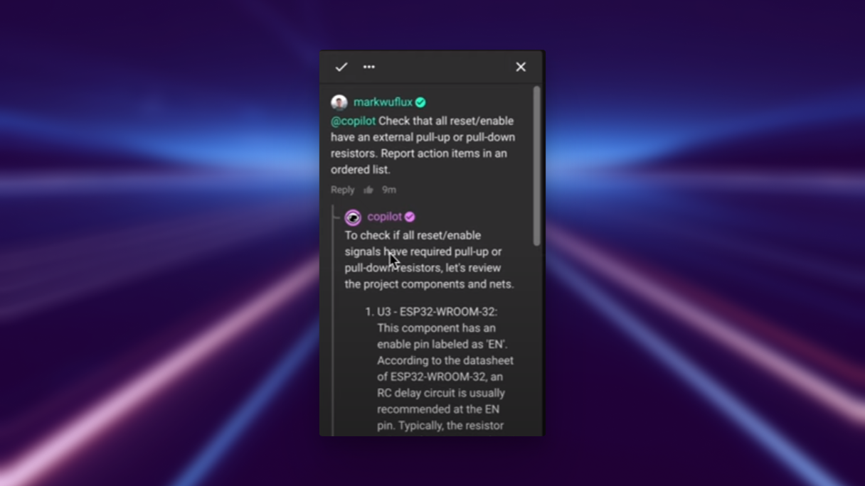 Flux is the industry's first AI-powered hardware design assistant integrated right into a PCB design tool. It is a custom-trained large language model (LLM) that understands your schematics, components, electrical connections, and bill of materials.