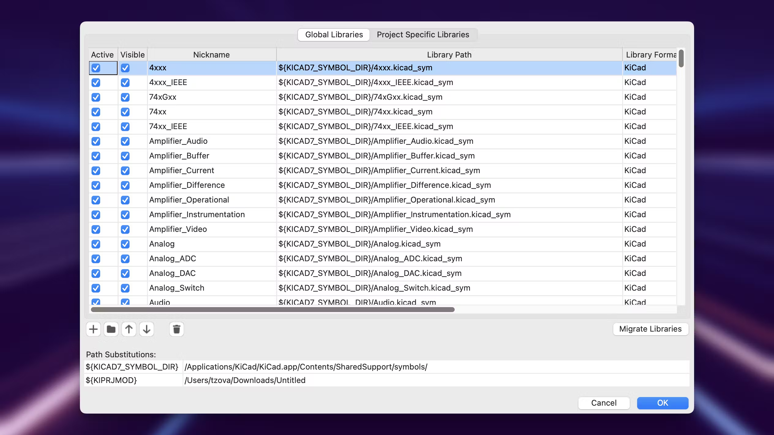 KiCad separates parts into Global and Project-specific libraries. And access to each library is managed in a project-by-project basis. Meaning every project potentially has access to a different set of libraries. This is configured in the “Set up symbol libraries” menu.