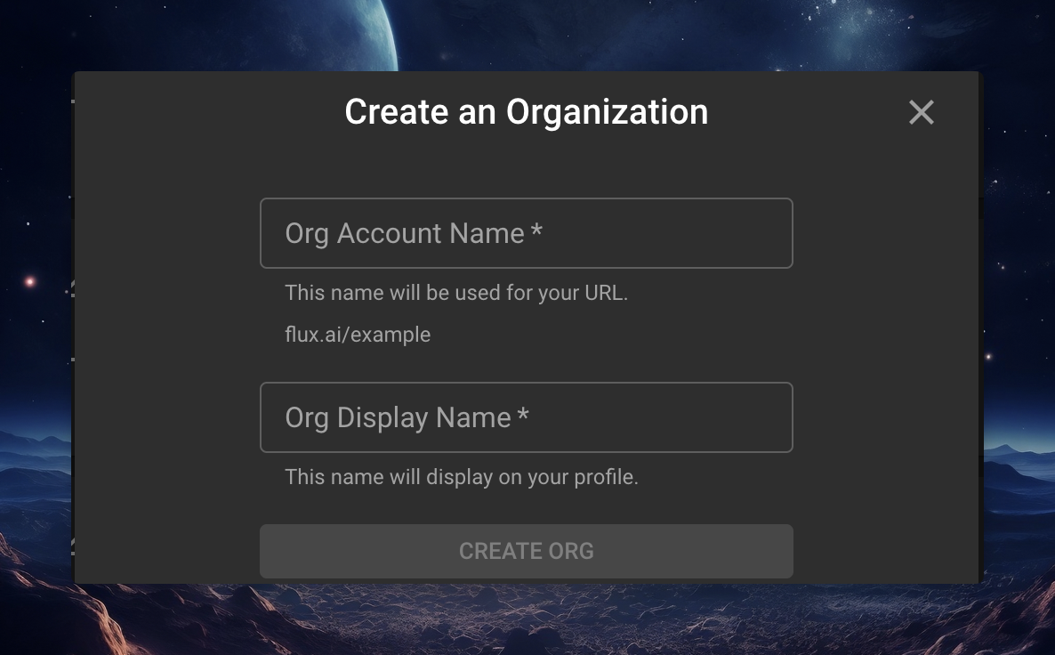 neworgwill result in the URLwww.flux.ai/neworg - Display name: the full name will be displayed on the organization's page. You can add spaces and special characters in the display name. For example, you can use