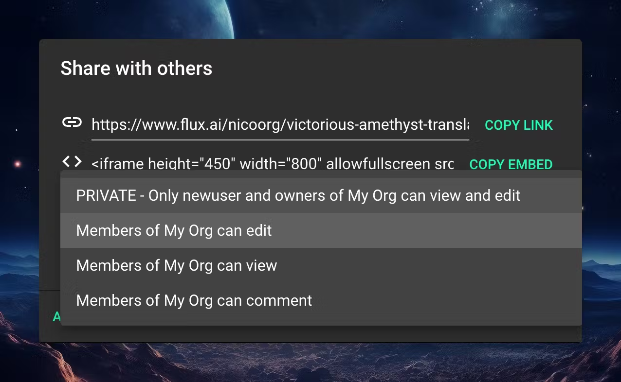 - Anyone on the internet: sets permissions for everyone on the internet at once. This means that anyone, Flux user or not, will have view/comment/edit access to your project.