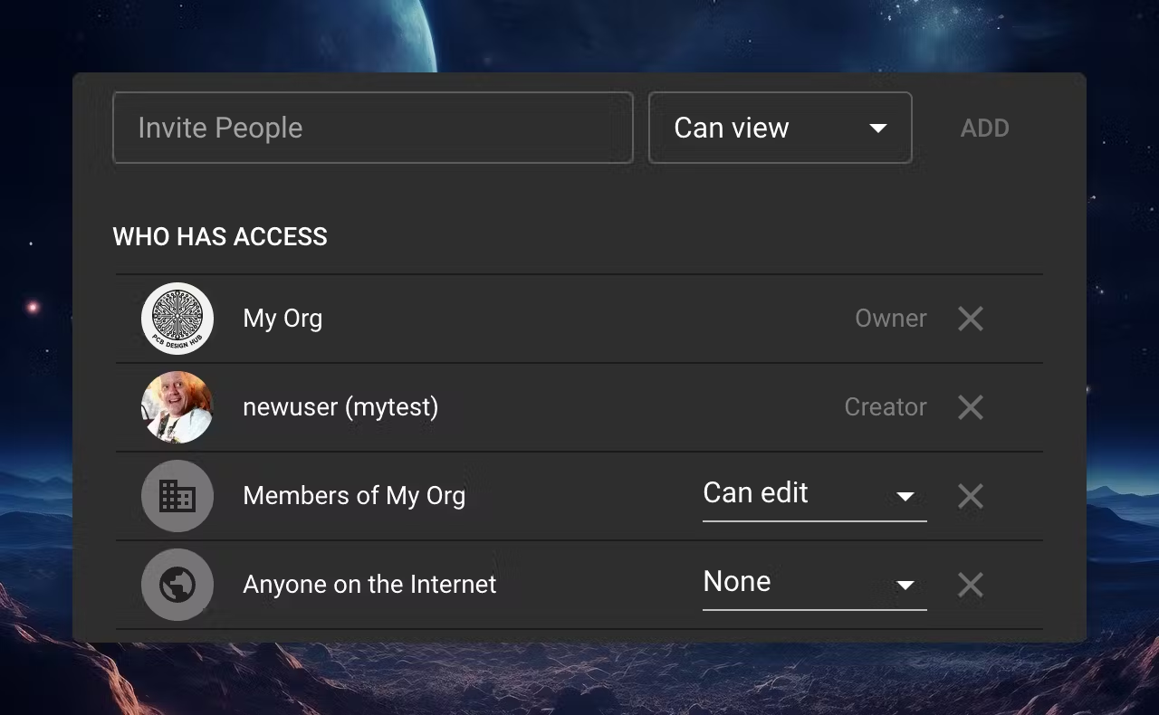 The standard share view allows you to manage permissions for other members of the organization: