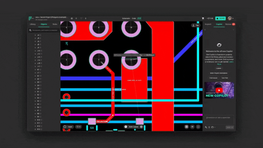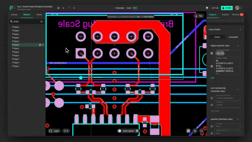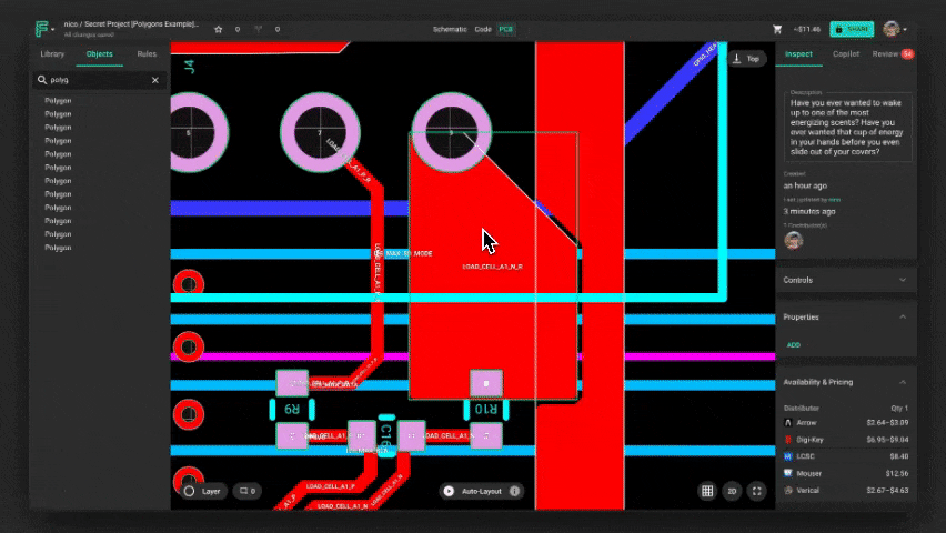 Polygons in Flux allow you to create custom copper shapes that are tied to specific nets. This feature is useful for creating: